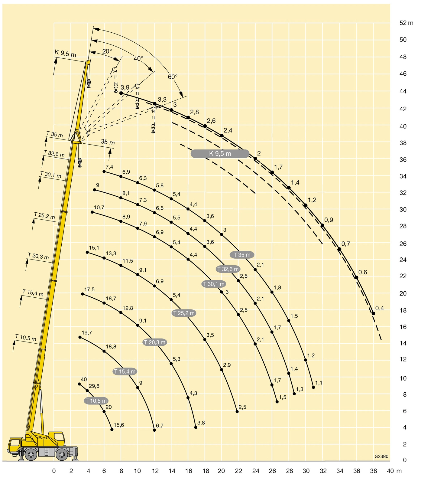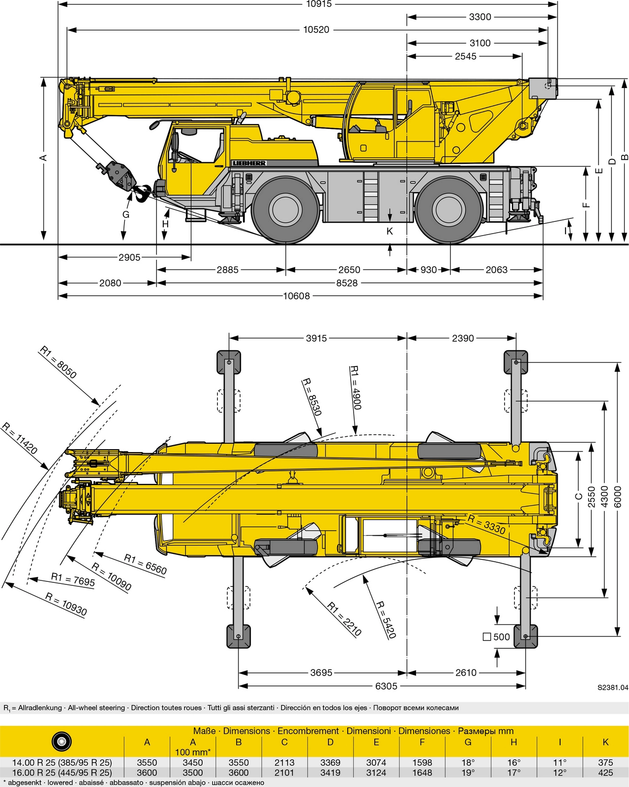Автокран Liebherr LTM-1040 обладает грузоподъемностью в 40 тонн в 2,5 метрах от своей оси. Кран оснащен телескопической стрелой, которая удлиняется до 35 метров. Кроме того, имеется возможность присоединения удлинителя до 9 метров, что в сумме дает возможность поднимать груз до 44 метров в высоту.