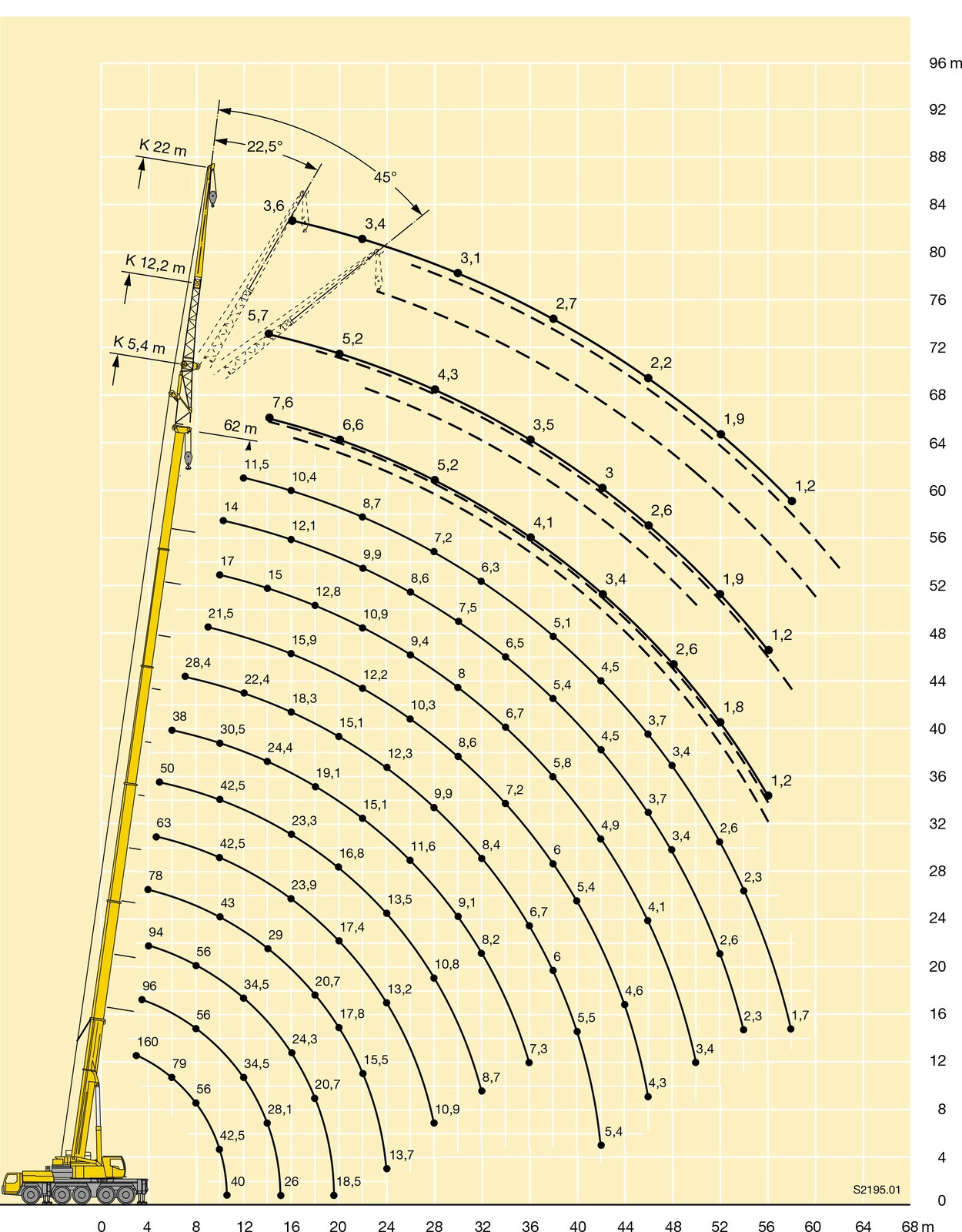 Автокран Liebherr LTM-1160 обладает грузоподъемностью в 160 тонн в 2,5 метрах от своей оси. Кран оснащен телескопической стрелой, которая удлиняется до 60 метров + имеется возможность присоединения удлинителя до 22 метров, что в сумме дает возможность поднимать груз до 82 метров в высоту. Наша компания предлагает услугу аренда автокрана 160 тонн как в Москве, так и по всей России. При длительных сроках аренды, цена на услугу аренда крана 160 тонн обсуждается индивидуально, и учитываются все нюансы и пожелания заказчика.